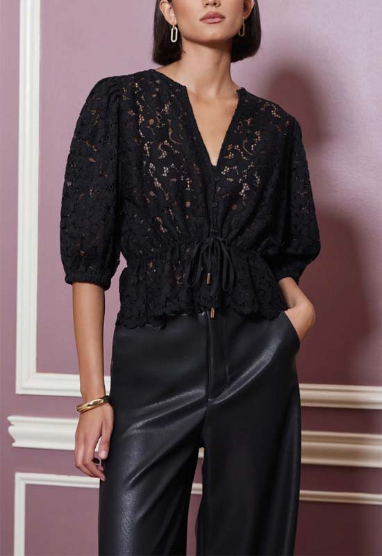 Elevate your wardrobe with the Bishop & Young Chloe Lace Top in Black. Crafted with delicate lace detailing, this top offers a sophisticated, feminine touch perfect for both day and night. Its lightweight fabric ensures comfortable wear while enhancing your silhouette with a flattering fit. Pair it effortlessly with skirts or jeans to create an elegant yet versatile look that stands out.