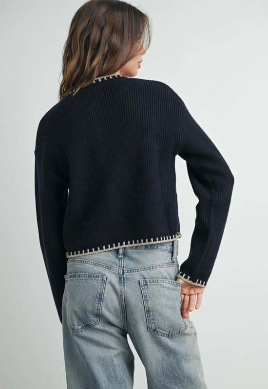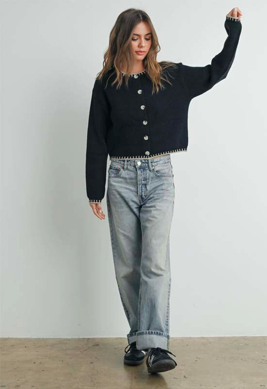 Elevate your wardrobe with this sleek black crew neck cardigan sweater, designed for timeless style and comfort. Its versatile fit makes it perfect for layering over shirts or dresses, adding warmth without bulk. Crafted to seamlessly blend with both casual and professional looks, this sweater is a must-have for effortless sophistication every day.