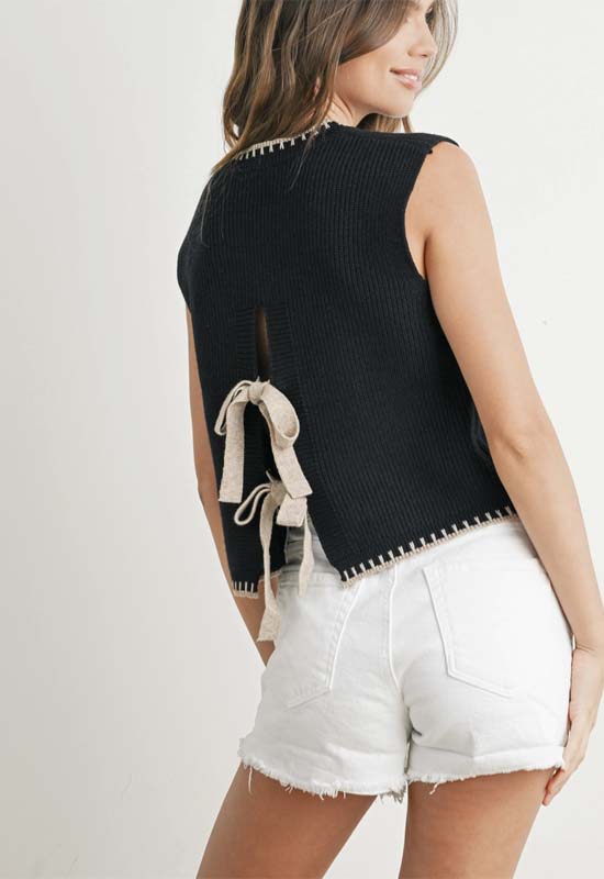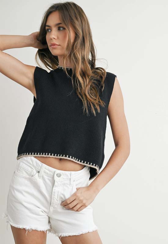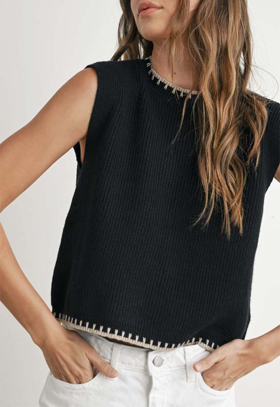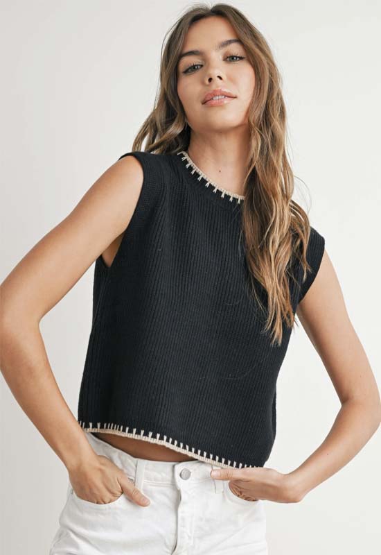 Effortlessly elevate your style with our Ribbed Sweater Vest Top in Black Taupe. The ribbed texture adds an edgy touch, while the sleeveless design keeps you cool and comfortable. Perfect for layering or standing out on its own. Stay chic and cozy all day long.