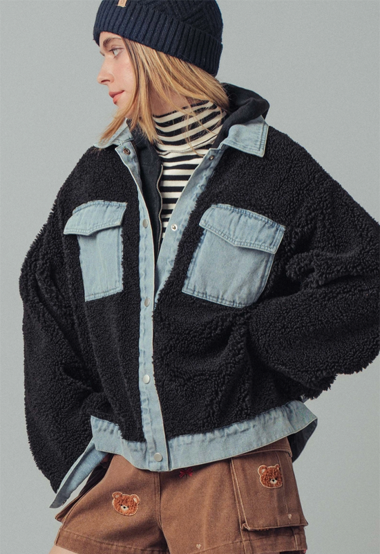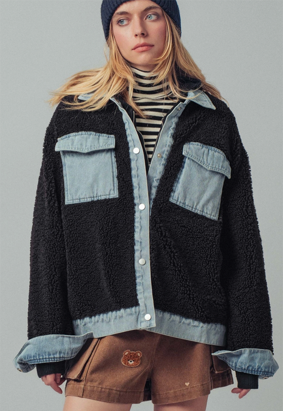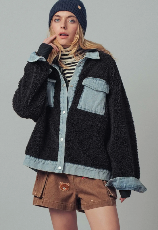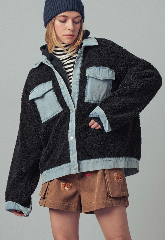 Elevate your layering game with this striking Contrast Sherpa Jacket, where mixed media construction meets modern style. The plush sherpa lining delivers cozy warmth without the bulk, while bold contrast detailing adds visual interest to any outfit. Versatile enough for casual weekends or dressed-up occasions, this jacket transitions seamlessly from season to season. Premium mixed media fabric ensures durability and comfort, making it a wardrobe essential that works as hard as you do. Experience the perfect balance of softness, style, and functionality.
