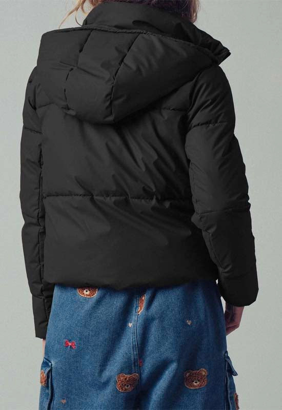 Stay warm and stylish with the Hooded Drawstring Puffer in black. This versatile jacket features a cozy hood and adjustable drawstring for a customized fit, providing excellent protection against chilly winds. Its sleek design pairs effortlessly with any outfit, making it the perfect outerwear choice for everyday comfort and cold-weather adventures.