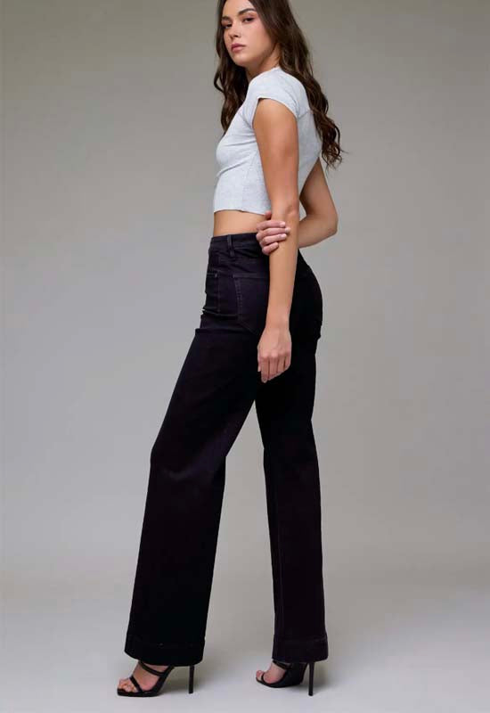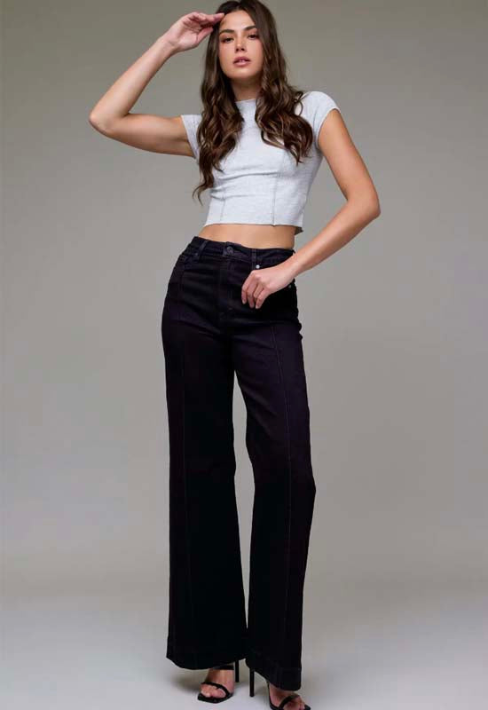 Experience effortless style and comfort with the Hidden - Happi High Rise Comfort Flare Pintuck Jean in Black. Designed with a flattering high rise and a subtle pintuck detail, these jeans enhance your silhouette while providing all-day comfort. The classic black wash offers versatile wear that seamlessly transitions from casual outings to chic evenings. Elevate your wardrobe with a pair that combines flattering fit and timeless style.
