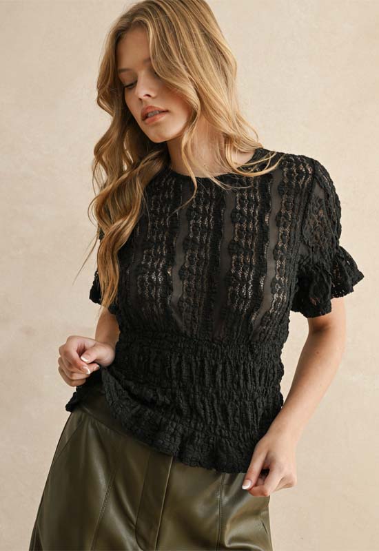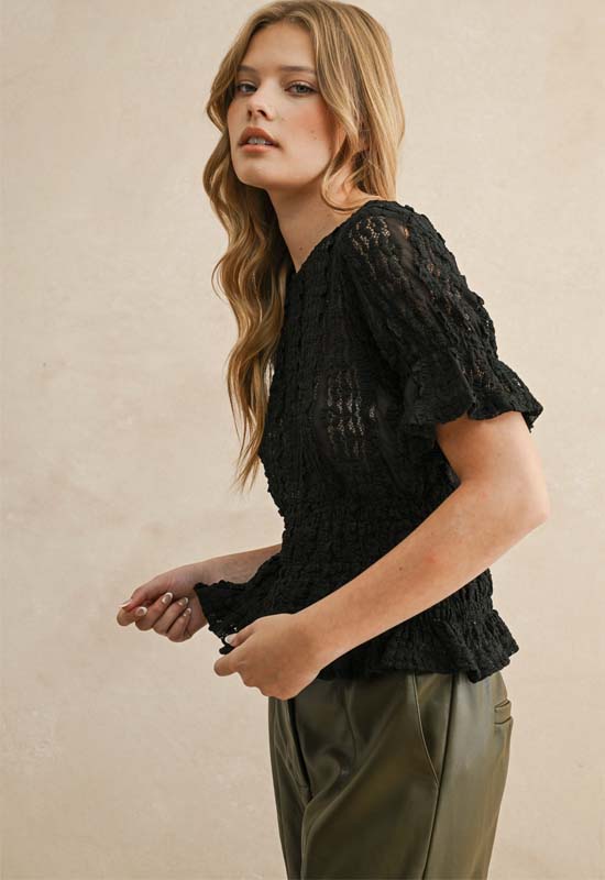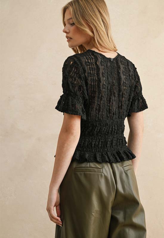 Elevate your wardrobe with this elegant Short Sleeve Lace Blouse in black. Its delicate lace design offers a sophisticated touch, perfect for both casual and dressy occasions. Lightweight and breathable, it ensures comfort while enhancing your style effortlessly. A versatile piece that pairs beautifully with skirts, trousers, or jeans for an effortlessly chic look.