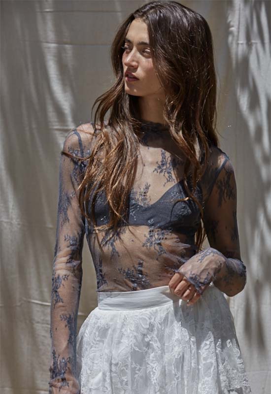 Knit Jacquard Lace Long Sleeve Top - Charcoal
