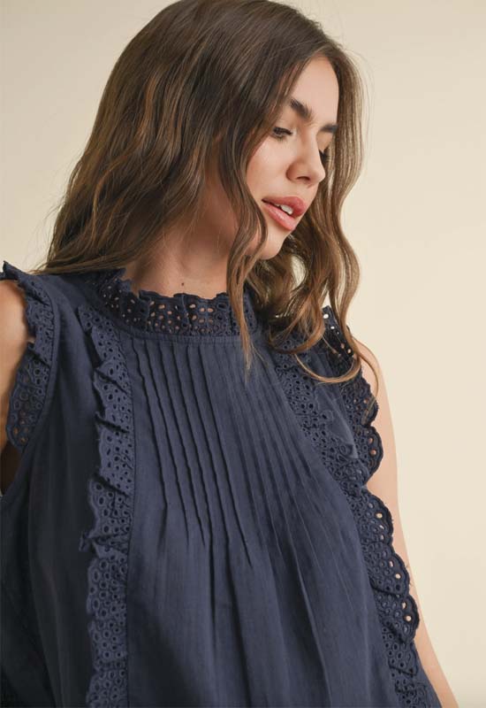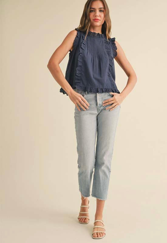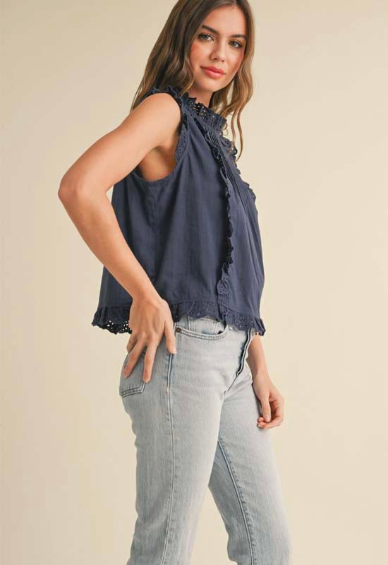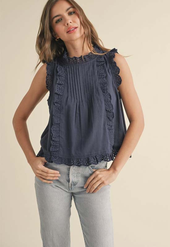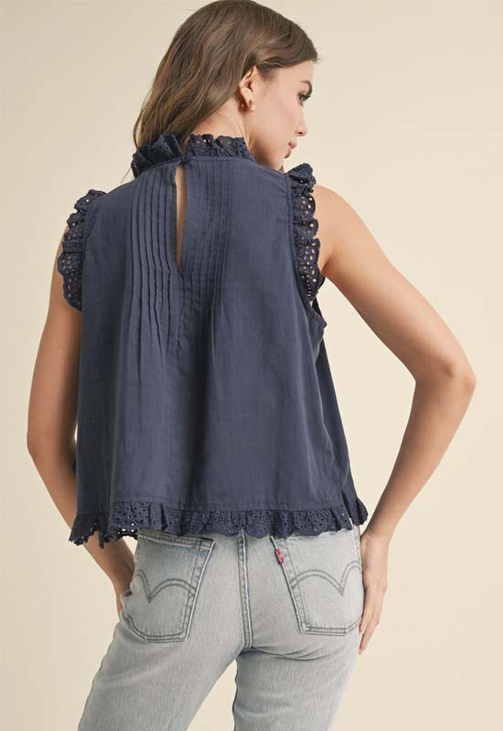 Eyelet Ruffled Trim Blouse - Navy