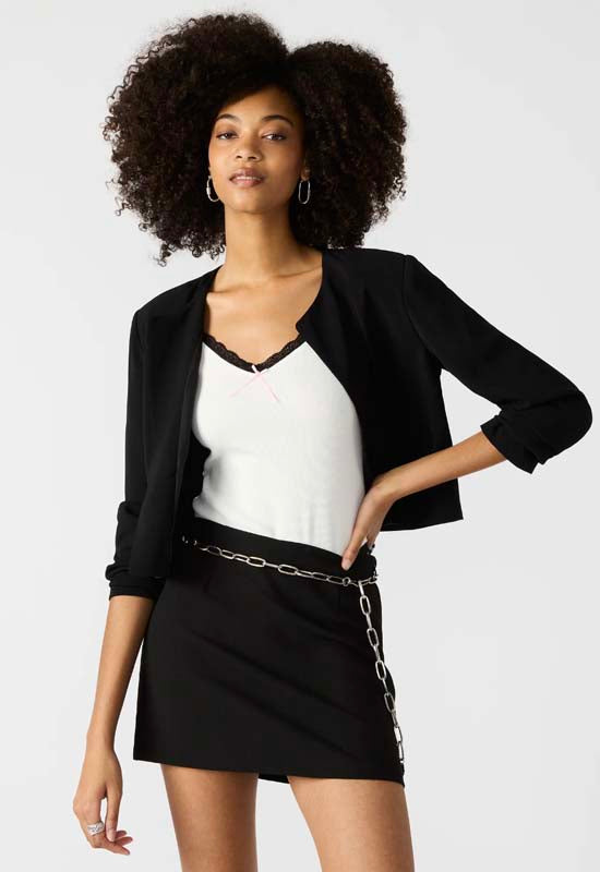 Get ready to stand out in style with the Steve Madden - Serena Blazer Black! This edgy blazer is perfect for adding a touch of sophistication to any outfit. With its sleek black design and tailored fit, you'll feel confident and powerful. Elevate your wardrobe with this must-have piece from Steve Madden.